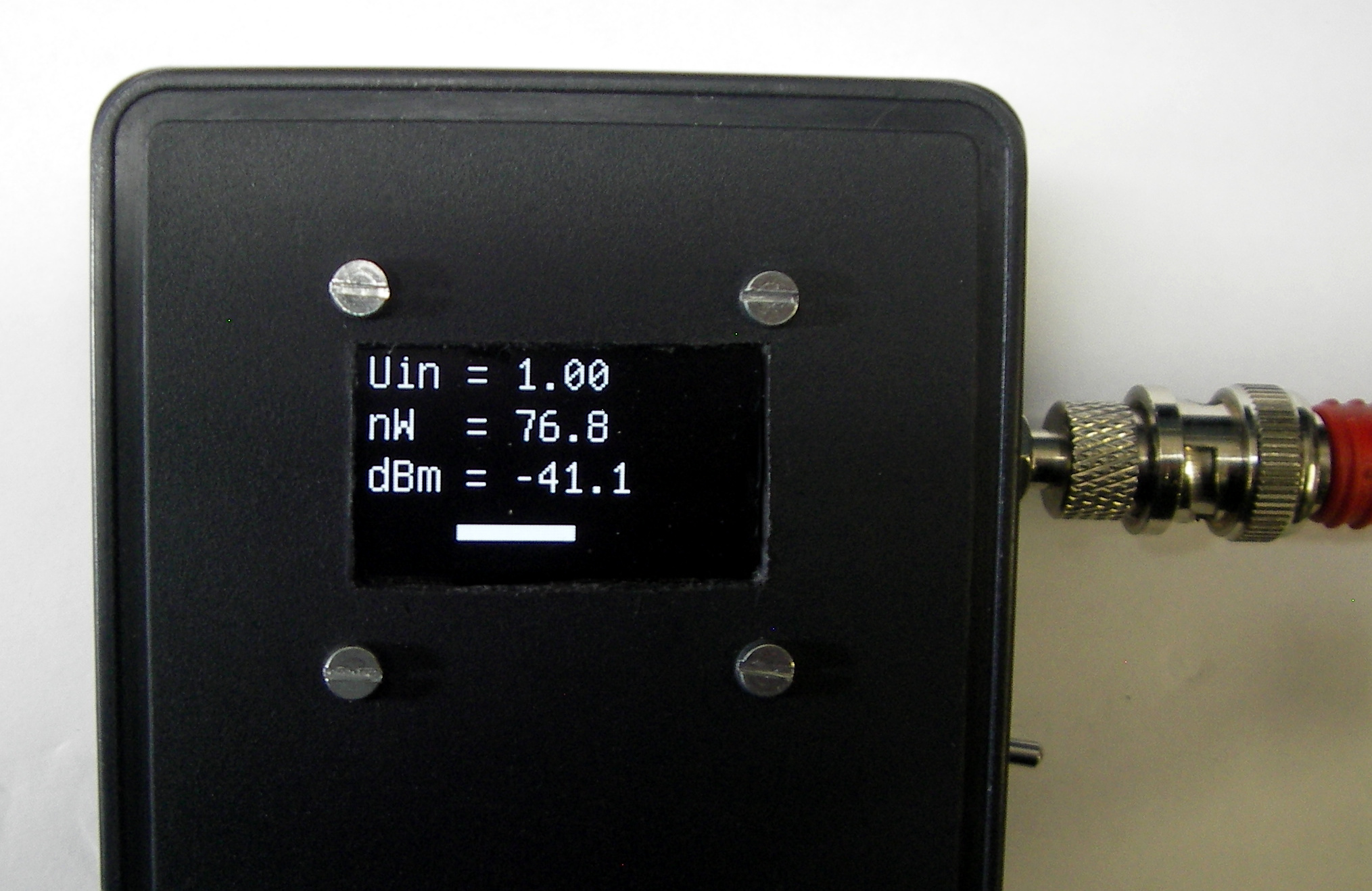 Ein Arduino-NANO in Verbindung mit einem AD8307 RF-Modul ermöglicht direkte Messungen von etwa -74 dBm bis +16 dBm.