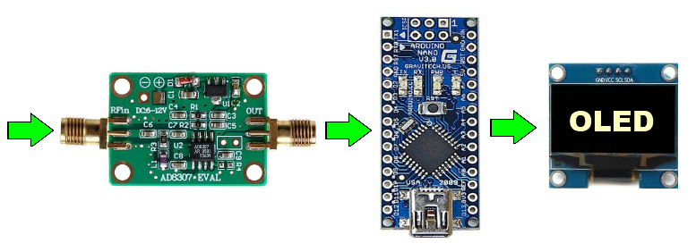 Zum Einsatz kommt, neben dem Arduino-NANO, ein logarithmisches Prüfdetektor Modul mit einem AD8307-Chip.
