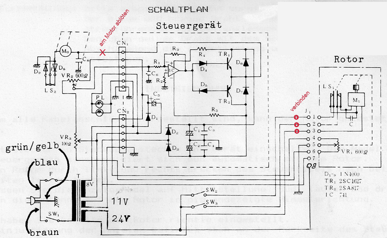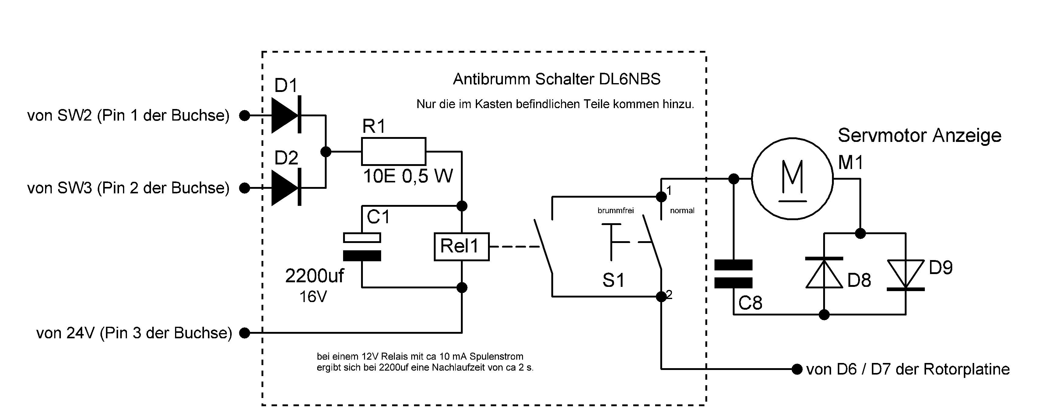 Einige EMOTATOR Rotortypen verfügen im Steuergerät über die ausgezeichnete 360 Grad Drehskala. Sie bildet durch den brückengesteuerten Servomotor im Steuergerät immer genau die aktuelle Richtung der Antenne ab. Im Prinzip eine einfache aber geniale Lösung wenn nur das lästige Brummen des Servos bei geringer Verstimmung der Brücke nicht wäre. Hierdurch kommt auch noch das Blechgehäuse in Schwingung und das ist nervig. Meistens kommen diese unkontrollierbaren Brummoffensiven dann, wenn gerade ein besonders schwaches CW-Signal zu den Ohren will. Jedenfalls hatte ich davon genug und löste das Problem mit der Antibrumm-Schaltung. Der Servomotor wird einfach abgeschaltet wenn der Rotor nicht dreht und schon ist Ruhe. Die kleine Schaltung passt locker in das Rotorgehäuse. Mit dem Schalter S1 kann die Mimik auch wieder auf mit Brumm gestellt werden.