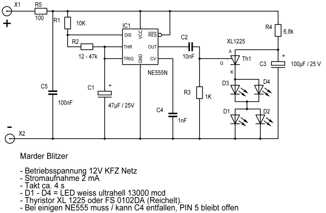 Vor einigen Jahren hatte mein Vierkreiser Marderbesuch. Mein Bruder hatte damals schon die Idee, die Gemütsruhe der lästigen Viecher im Motorraum mit einem Blitzer zu unterbinden und einen Flasher gebaut. Sein erfolgreiches Konzept hab ich nun erneut aufgelegt und in die Autos meiner Enkel eingebaut da Marder erneut zugeschlagen haben.
