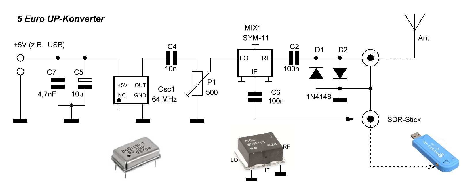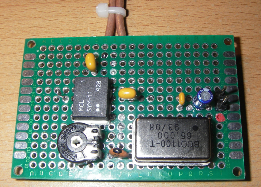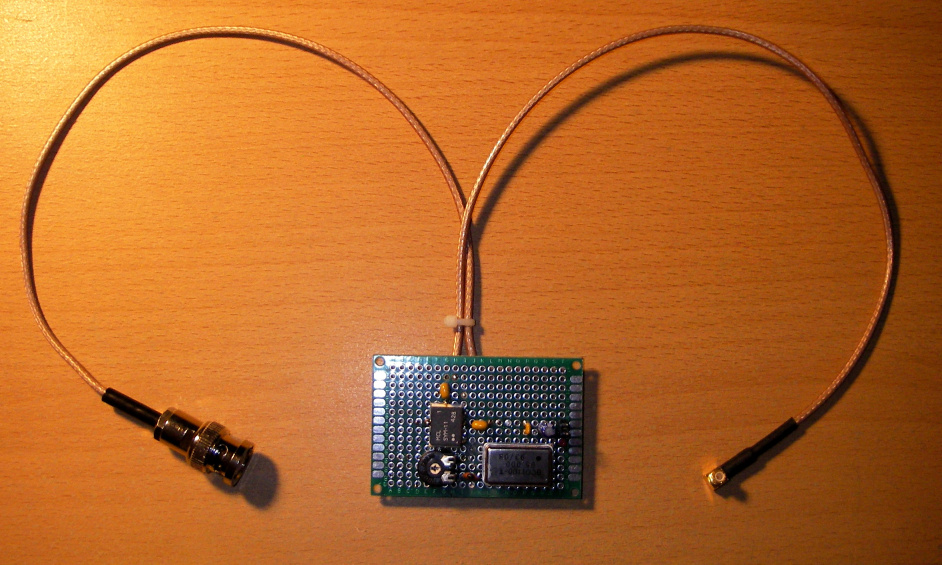 Neben o.g. Mixern fand ich bei Pollin 64 MHz Oszillatoren für 60 Cent und gebrauchte SMA/MCX Kabel für 1,95 €. Somit betrug die Investition Mischer, Oszillator, Stecker/Kabel insgesamt 4,50 Euro plus einige Kleinteile aus dem Bastelkeller.
